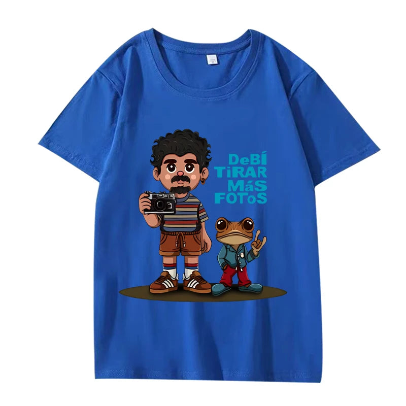 This blue t-shirt features a fun and nostalgic design centered around the phrase “Debí Tirar Más Fotos” — Spanish for “I should’ve taken more photos.” A perfect blend of Latin culture, humor, and retro style for photography fans and creatives alike.