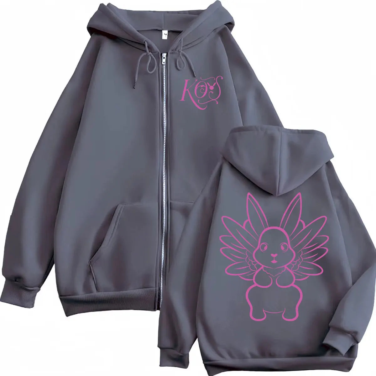 Shop the Kenia OS dark grey zipper hoodie, a stylish zip-up sweatshirt designed for fans who love trendy streetwear and exclusive pop-inspired merch.
