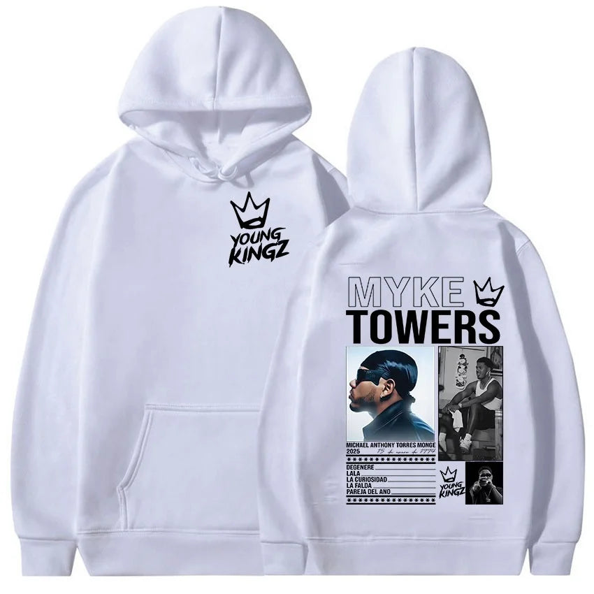 Featuring the Young Kingz crown logo on the front and a striking tour graphic on the back—including portraits of Myke Towers and a list of standout tracks—this hoodie pays tribute to his artistic evolution. Premium-quality printing ensures long-lasting vibrancy, keeping the details sharp and the colors crisp wash after wash.
