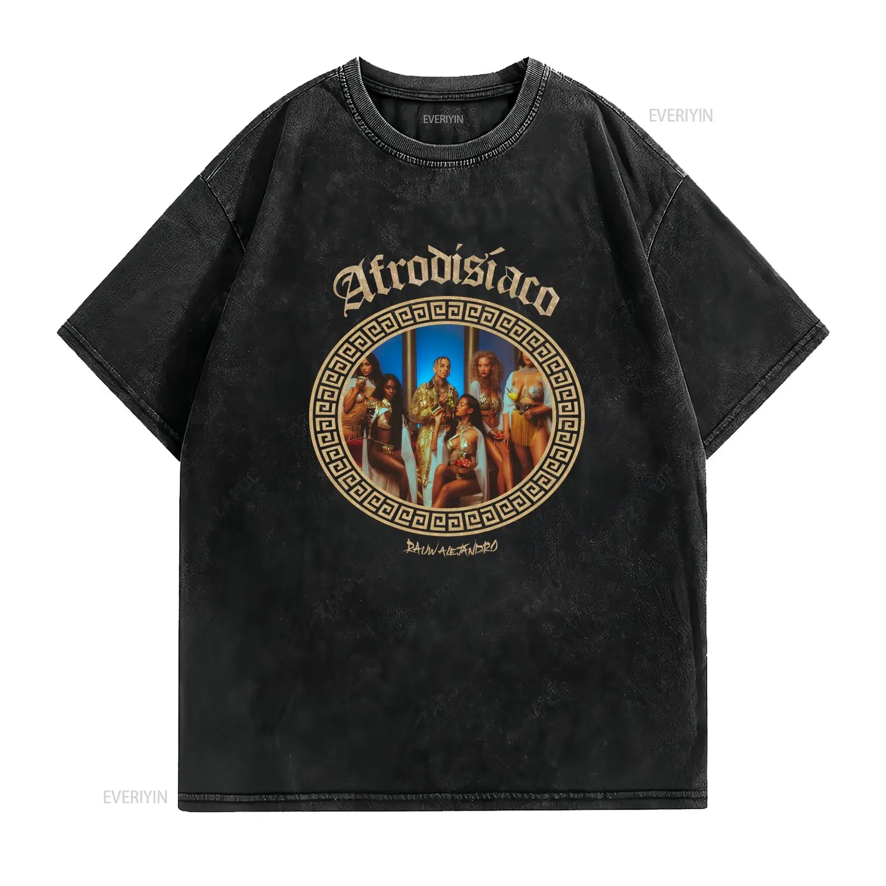 The Rauw Alejandro “Afrodisíaco” Album Cover T-Shirt – Black Vintage, as shown in the product images, pays homage to Rauw Alejandro’s iconic Afrodisíaco era — the project that elevated him to global recognition. The design features the legendary album cover framed in a gold baroque pattern, delivering a strong visual tribute to reggaeton culture and futuristic sensuality.