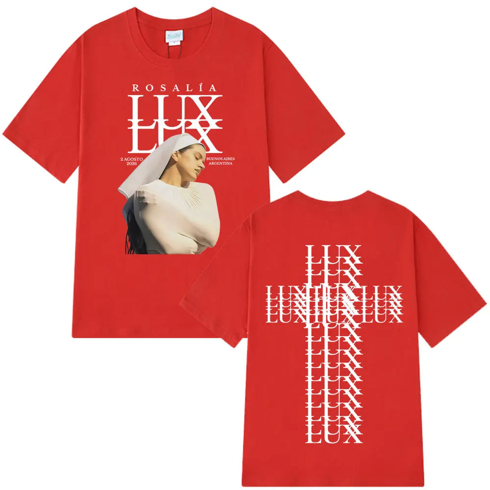 The front features a striking Rosalía LUX visual with tour details, while the back showcases a bold repeated “LUX” typography design that creates strong visual impact. The red color amplifies the graphics, turning this T-shirt into a true statement piece inspired by live music culture.