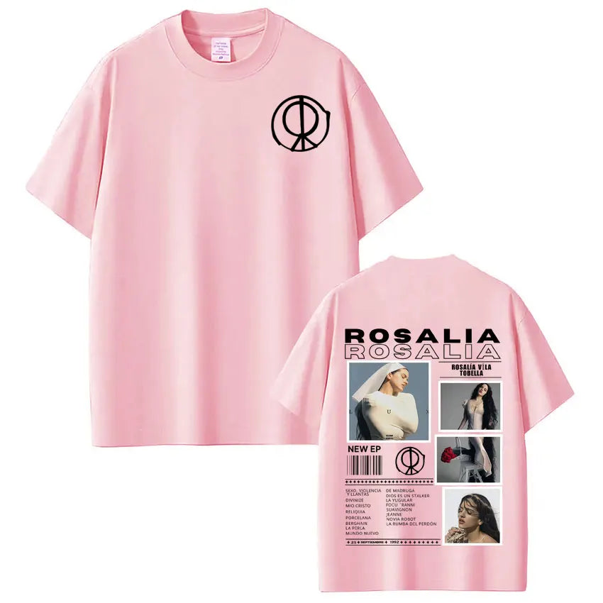The minimalist front logo is paired with a detailed back print featuring Rosalía-inspired album visuals and modern typography. The pink color enhances the visual appeal of the graphics, creating a fresh and stylish statement piece.
