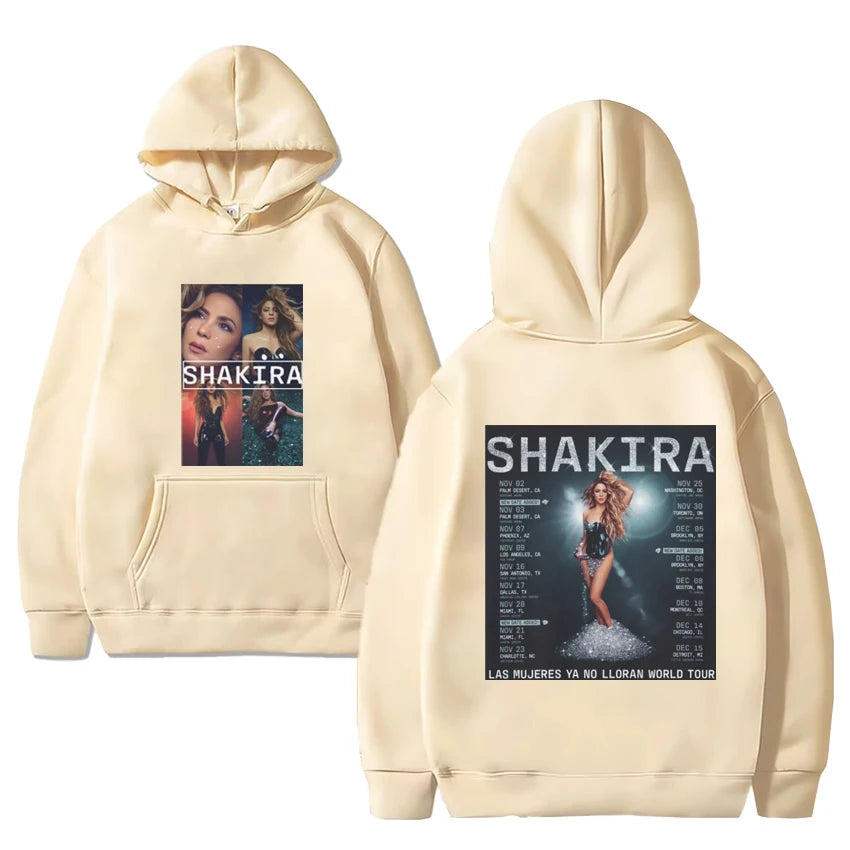 This official-style Shakira hoodie pays tribute to her powerful Las Mujeres Ya No Lloran World Tour. Featuring a dynamic collage of Shakira’s recent stage looks on the front and a full tour date listing on the back, this beige hoodie is a must-have for true fans of Latin pop’s global icon.